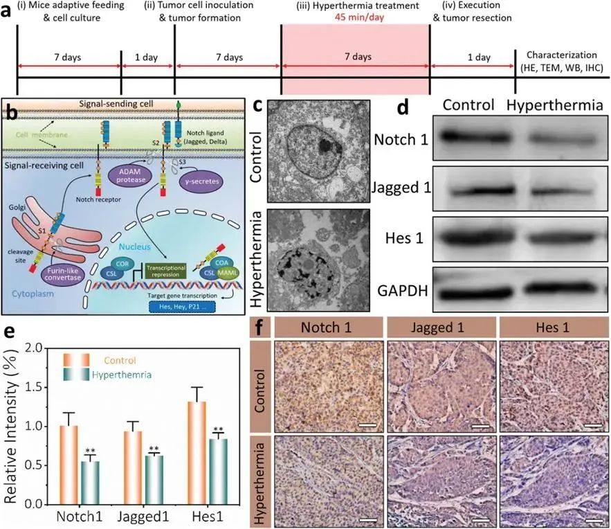 为了探究热疗抑制肿瘤生长的生理机制,使用透射电子显微镜对肿瘤细胞进行观察,发现热疗组肿瘤细胞出现明显的细胞凋亡形态变化。进而又继续研究了与凋亡相关的Notch信号通路靶分子的表达。与对照组相比,热疗组的蛋白质印迹结果显示出 Notch 1、Jagged 1 和 Hes 1 蛋白的下调表达。此外,相应的免疫组织化学分析也支持这一点结论。这些结果共同证实了热疗可以通过诱导肿瘤细胞凋亡显著抑制皮下肿瘤生长,而Notch信号通路在其中起重要作用。