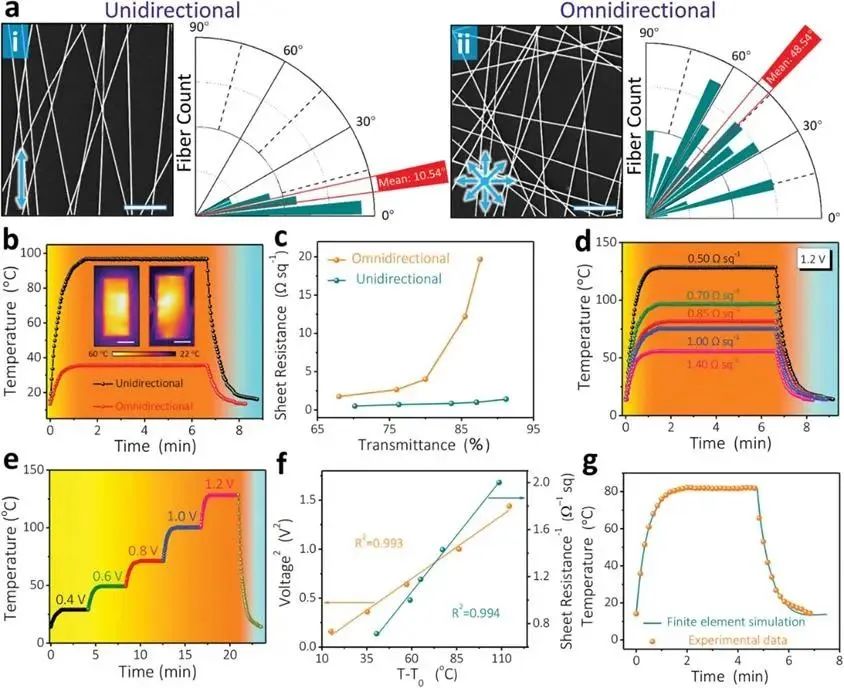 研究发现,与随机分布银纳米纤维网络相比,定向排列银纳米纤维网络显示出更优异的透明性、导电性和加热性能。在92%透明度下,定向排列银纳米纤维网络的方块电阻仅为1.4Ω/□,当加载1.2 V电压时,可迅速升温至56 oC。通过有限元模拟和理论分析,解释了超长定向排列银纳米纤维网络的电子输运特性和加热规律,实验结果与理论模拟高度吻合。