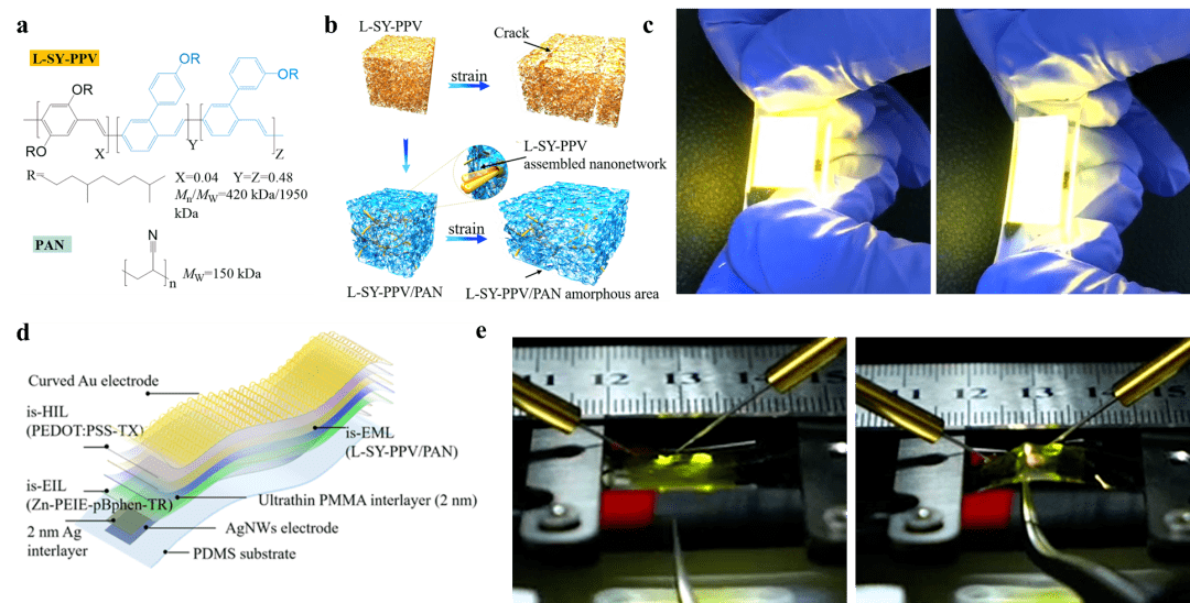 本征柔性L-SY-PPV/PAN的薄膜在拉伸条件下的光致荧光图片;d)本征柔性拉伸PLED的器件结构;e) 在尖锐的镊子干