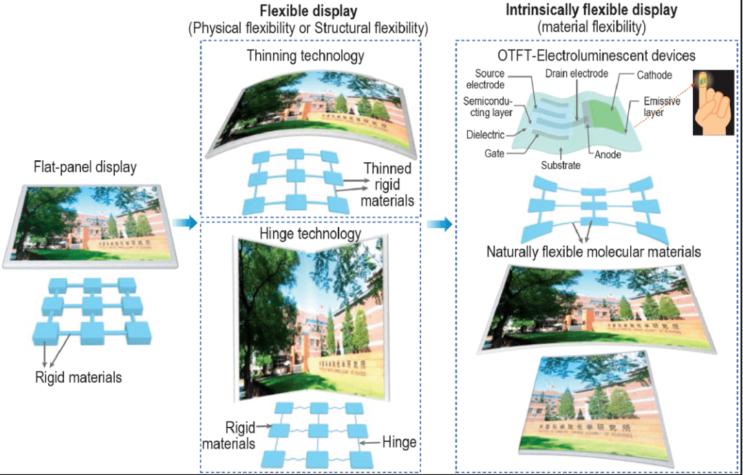 图2 显示从硬质到柔性以及未来本征柔性的示意图