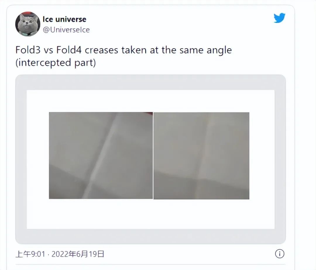 知名Twitter 爆料帐号Ice universe 推文显示,下一代三星折叠手机Galaxy Z Fold4 屏幕可能还是会有一定程度折痕,但会比Galaxy Z Fold3 更不明显点,可能浅20%。