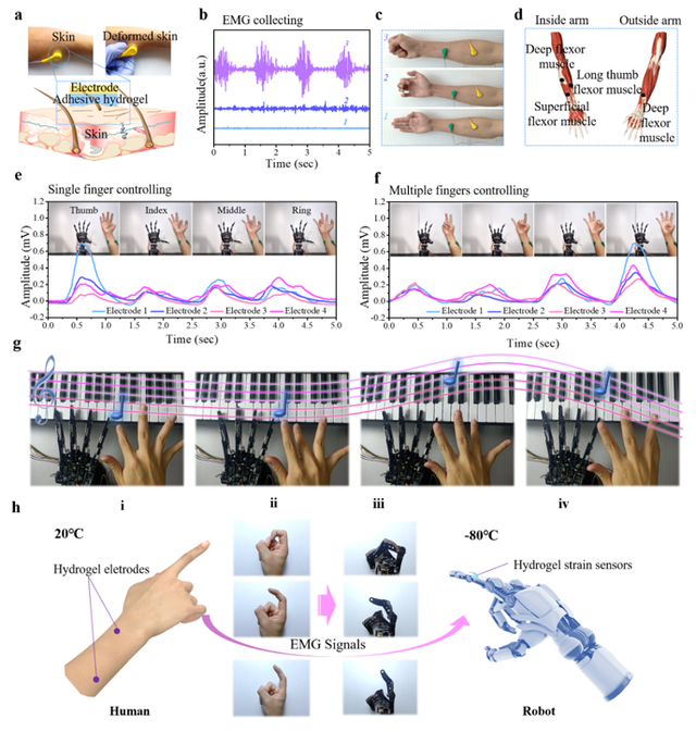 基于面投影微立体光刻技术加工水凝胶用于肌电信号的采集,将采集的肌电信号作为人机接口控制机械手的同步运动,以完成弹奏不同音符、甚至低温环境的动作控制