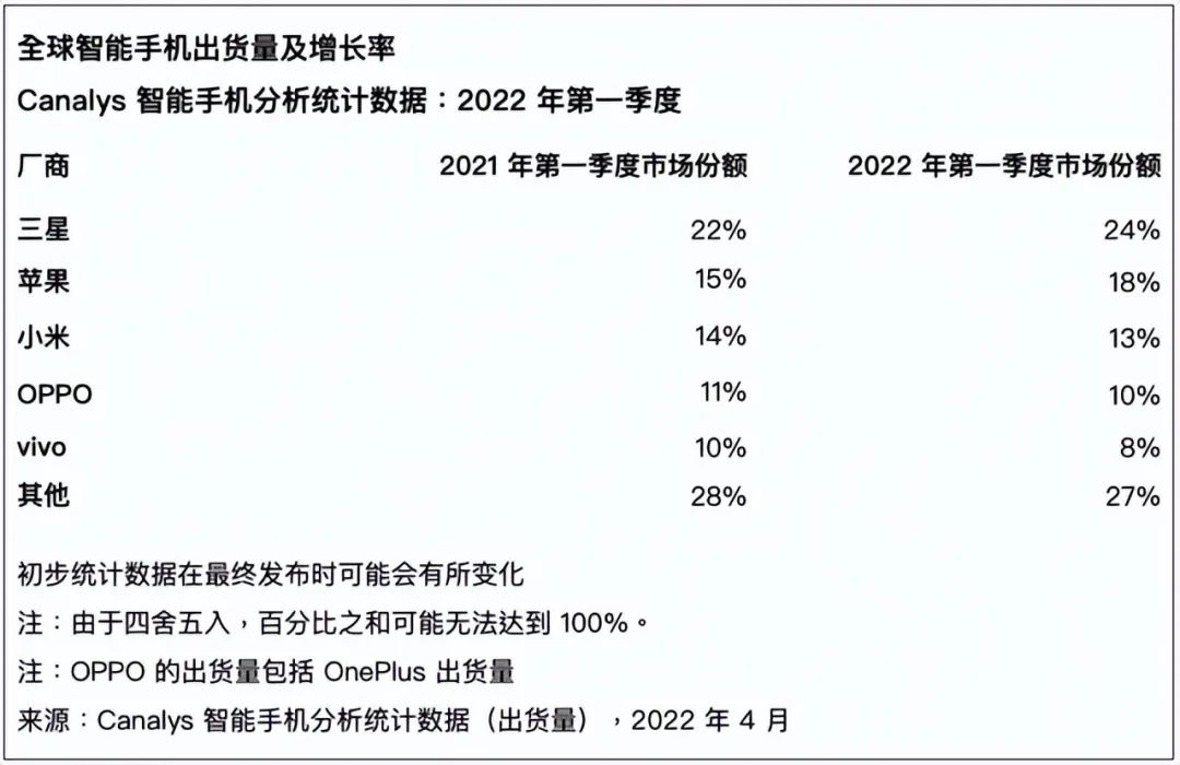报告显示,随着供应商改进2022年的产品组合,三星以24%的市场份额领先市场,高于其2021年第四季度的19%。而苹果排名第二,得益于iPhone 13系列的市场需求日益增长,第一季度表现稳健。由于Redmi Note系列的出色表现,小米保持在第三位。OPPO(包括一加)和vivo分别以10%和8%的份额位列前五。