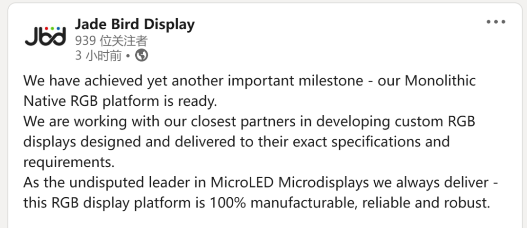 据悉,JBD 将于 2024 年上半年在各种行业活动中展示原生彩色单片多色投影仪的原型。这些面板计划于 2025 年进行批量生产。